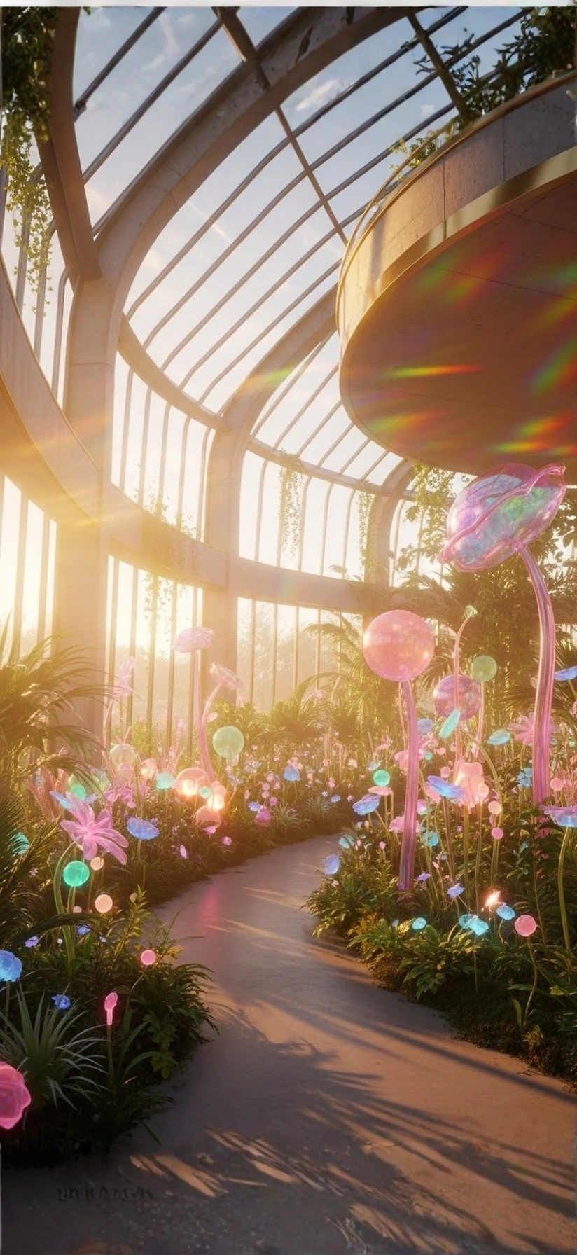 Dieses Wallpaper zeigt eine Welt, in der die Natur aus dichroitischem Glas und leuchtenden Gelee-Strukturen besteht. Diese biolumineszenten Pflanzen strahlen ein sanftes, inneres Licht aus, das sich mit den Sonnenstrahlen der "Goldenen Stunde" vermischt. Das Ergebnis ist ein visuelles Fest aus Pastelltönen, Regenbogen-Lichtbrechungen und schimmernden Oberflächen.